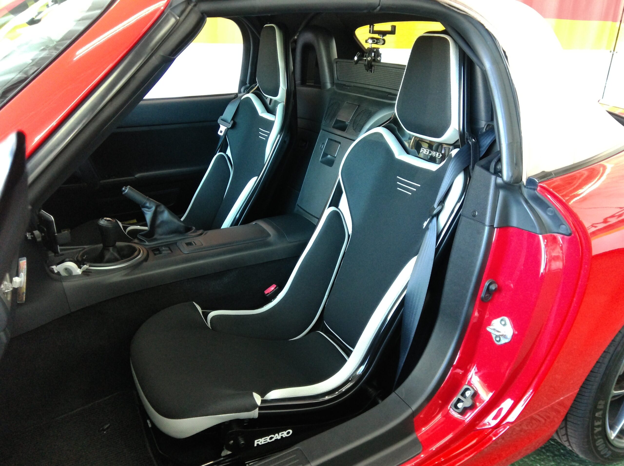 RCS サウンドエディション ブラックシェル/シルバーメッシュ左右のお取り付けです。レカロ純正シートレールを使用して純正シートのヒップポイントより15mm程度ひくくお取り付けしております。NCロードスターにRCSをお取り付けする場合最大で20mm程度のダウン量になります。極端に低くお取り付けすることが出来ません。低くできないからと言って不快になるわけではなくトライアルなら快適なドライビングポジションに調整することが出来ます。